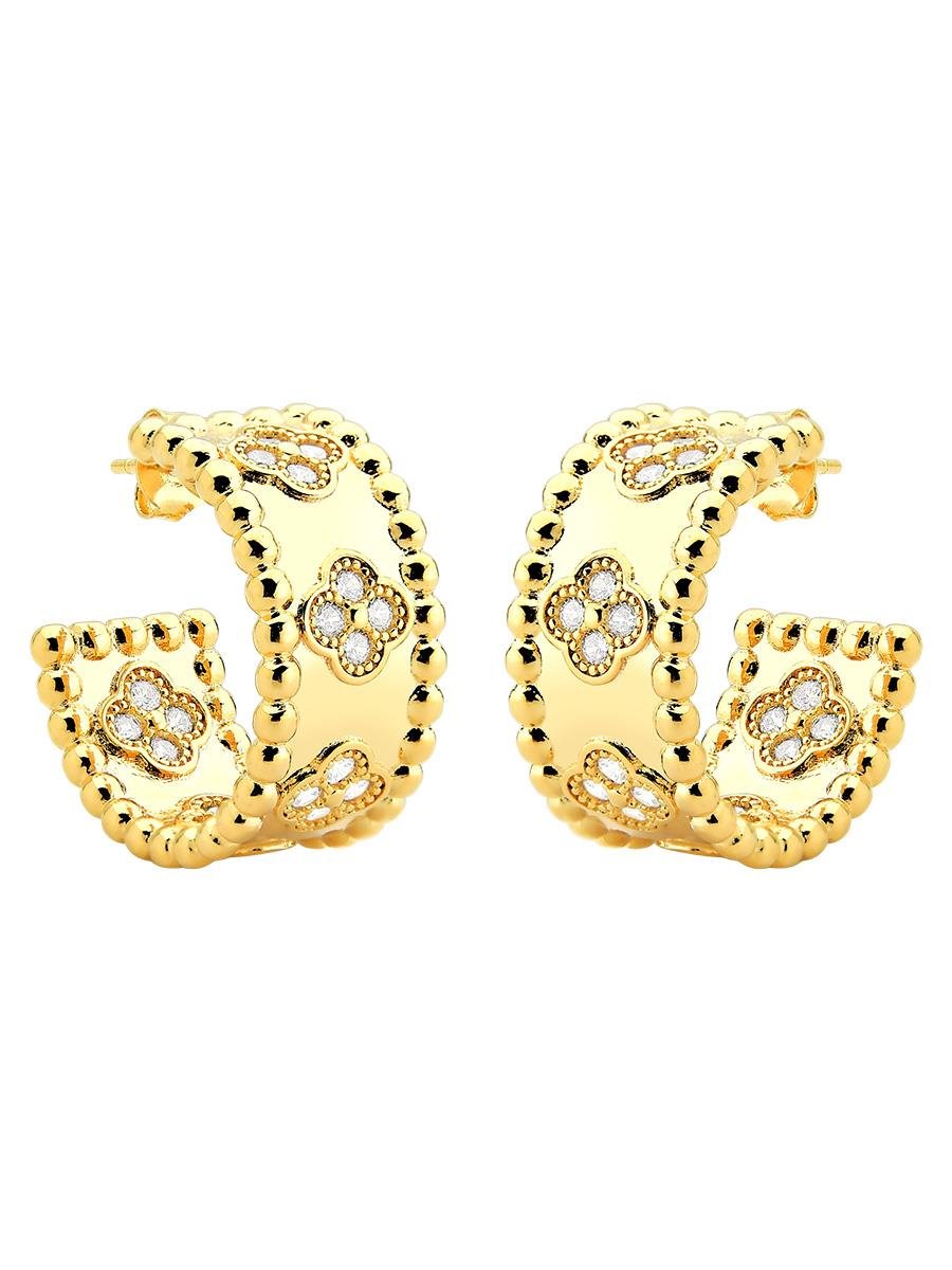 Brinco de meia argola lisa com flores cravejadas com zircônias incolores, banho de ouro 18k.| Altura | 2.2 cm |