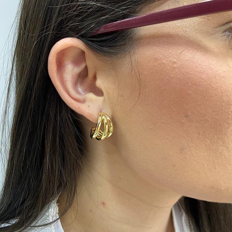 Meia Argola Tubo Três Fios Banhado a Ouro 18k.Argolas são peças indispensáveis em qualquer mostruário. Clássicas, versáteis e atemporais, combinam com todos os estilos e ocasiões, do look básico ao mais elegante. São modelos que despertam interesse nas clientes e garantem vendas constantes, já que nunca saem de moda. Ter argolas na maleta é oferecer um acessório que sempre terá saída e manter o mostruário preparado para atender qualquer gosto.