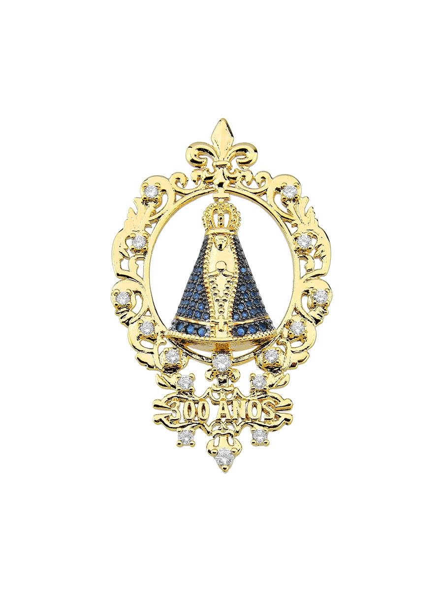 Pingente dos 300 anos de Nossa Senhora Aparecida cravejado com zircônias safiras e aplique de ródio negro e detalhes com zircônia incolor, banho de ouro 18k.| Tamanhos | |