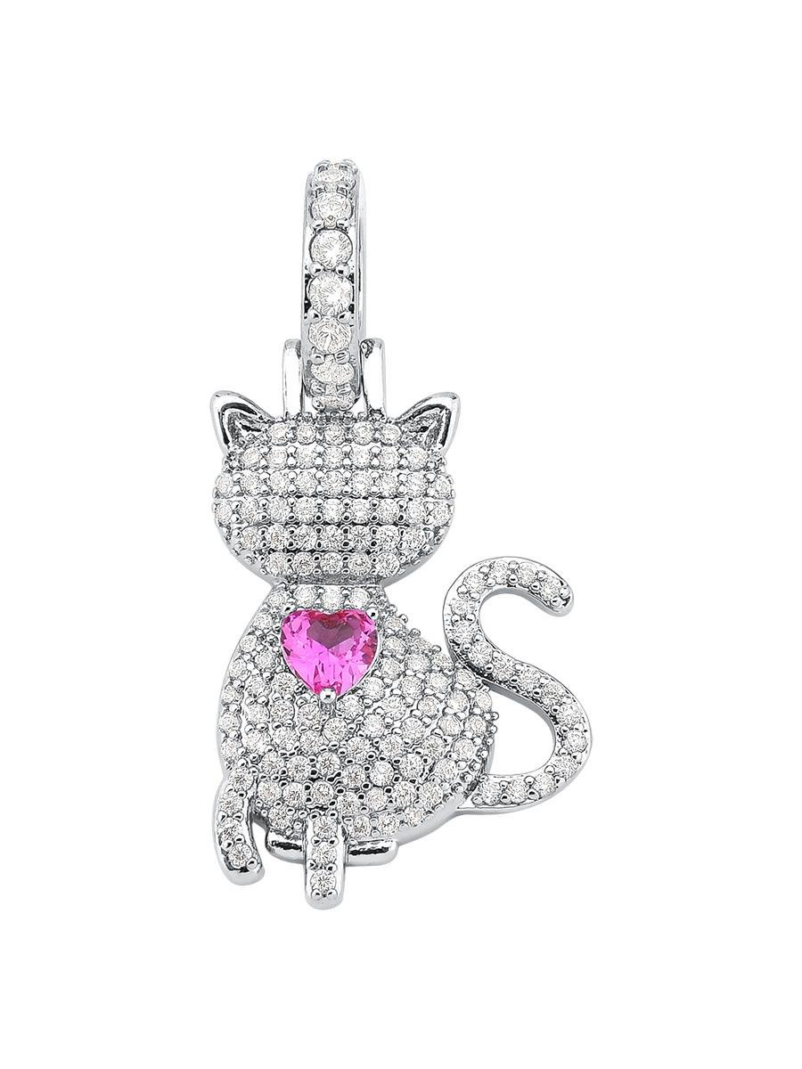 Pingente em formato de gato cravejado com zircônias incolores e coração rosa, banho de ródio branco.| Altura | 2.8 cm |
