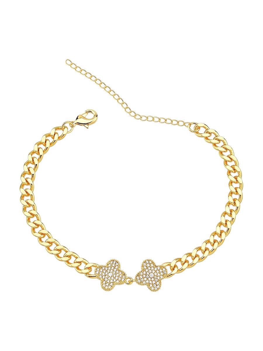 Pulseira de elo com trevo cravejado de zircônias incolores, no banho de ouro 18k.| Comprimento | 19 cm (mais 5 cm de extensor) |