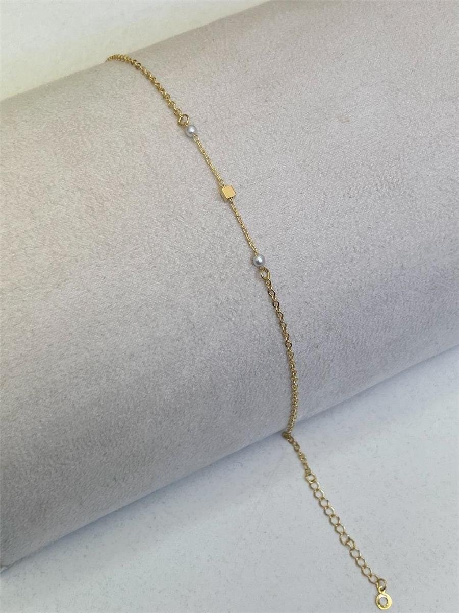 Tornozeleira Pérola e Quadrado Banhado a Ouro18K.| Comprimento | 23 + 3 cm |