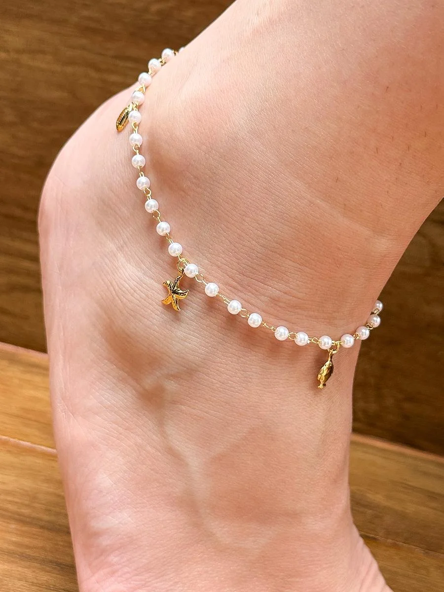 Tornozeleira Pérolas com Pingentes Marinho Banhado a Ouro 18K.A cápsula Summer Part III é inspirada no mar, na brisa da praia e na beleza natural das pérolas. A coleção reúne peças leves, femininas e atuais, pensadas para o clima do verão. Com um design versátil e atemporal, as semijoias acompanham diferentes momentos do dia, do look casual ao mais arrumado, sempre com um toque de leveza e estilo. São peças que combinam com o verão, mas continuam fazendo sentido em qualquer estação.