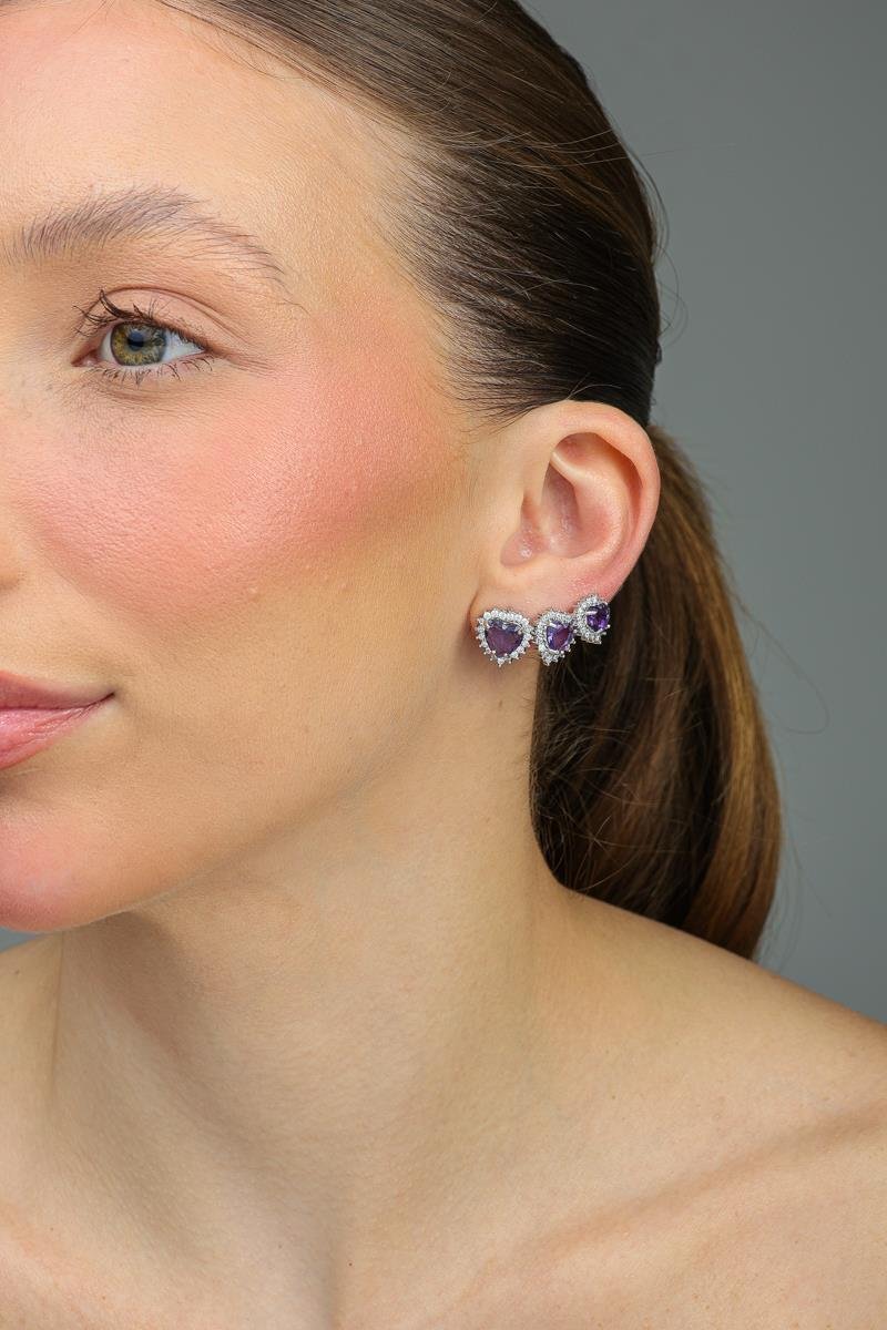 Trio De Brinco Coração Cravejado Roxo, Banhado a Ródio Branco.Após o sucesso da primeira edição, a Coleção Spring II chega com ainda mais estilo e sofisticação. Essa coleção exclusiva foi pensada especialmente para revendedoras de semijoias que desejam oferecer peças modernas, elegantes e atemporais, aumentando suas vendas com modelos de alta procura no mercado.